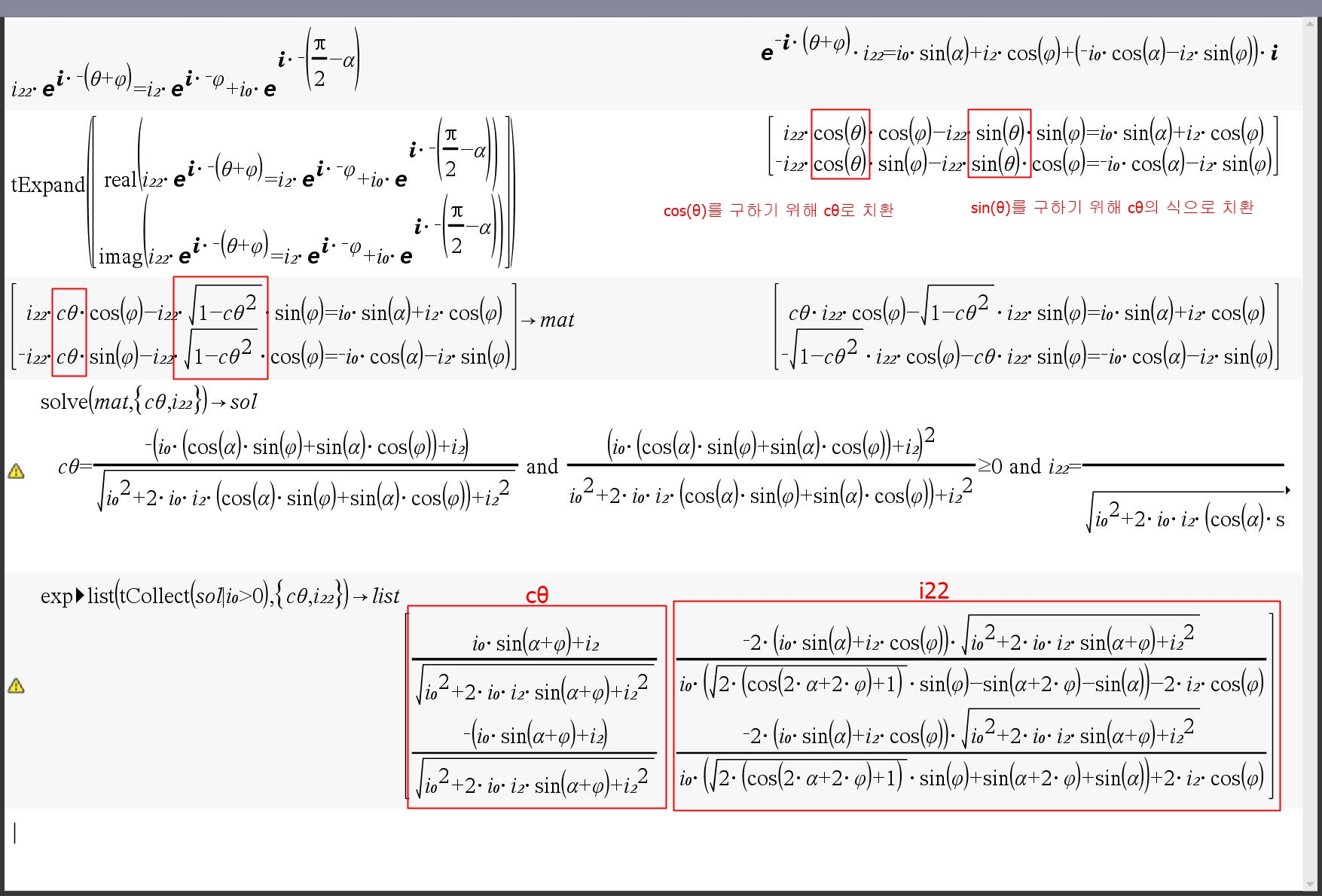 예제와 같이 동일한 벡터 수식을 각도를 변환해서 풀이를 해 보면 cosθ는 동일하게 나오는데 i22가 다르게 나옵니다.