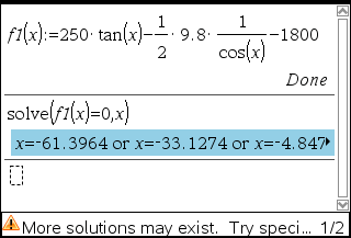 250*tan(x) - (1/2)*g*(1/cos(x)) = 1800 을 만족하는 x 는? (g=9.8)