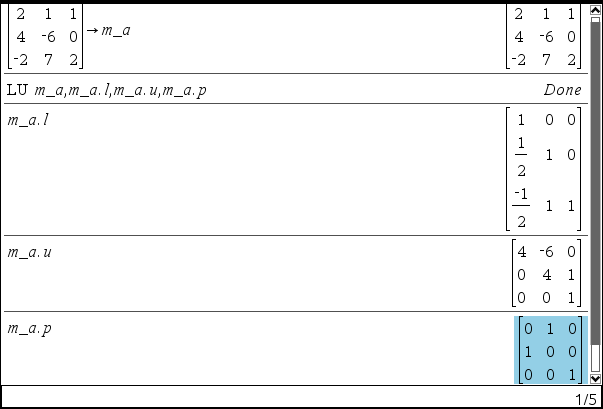 nspire 에서는 P*A = L*U 꼴로 지맘대로 변형하여 분해하기 때문에 답안지와 다른 풀이를 보여줄 수도 있습니다.